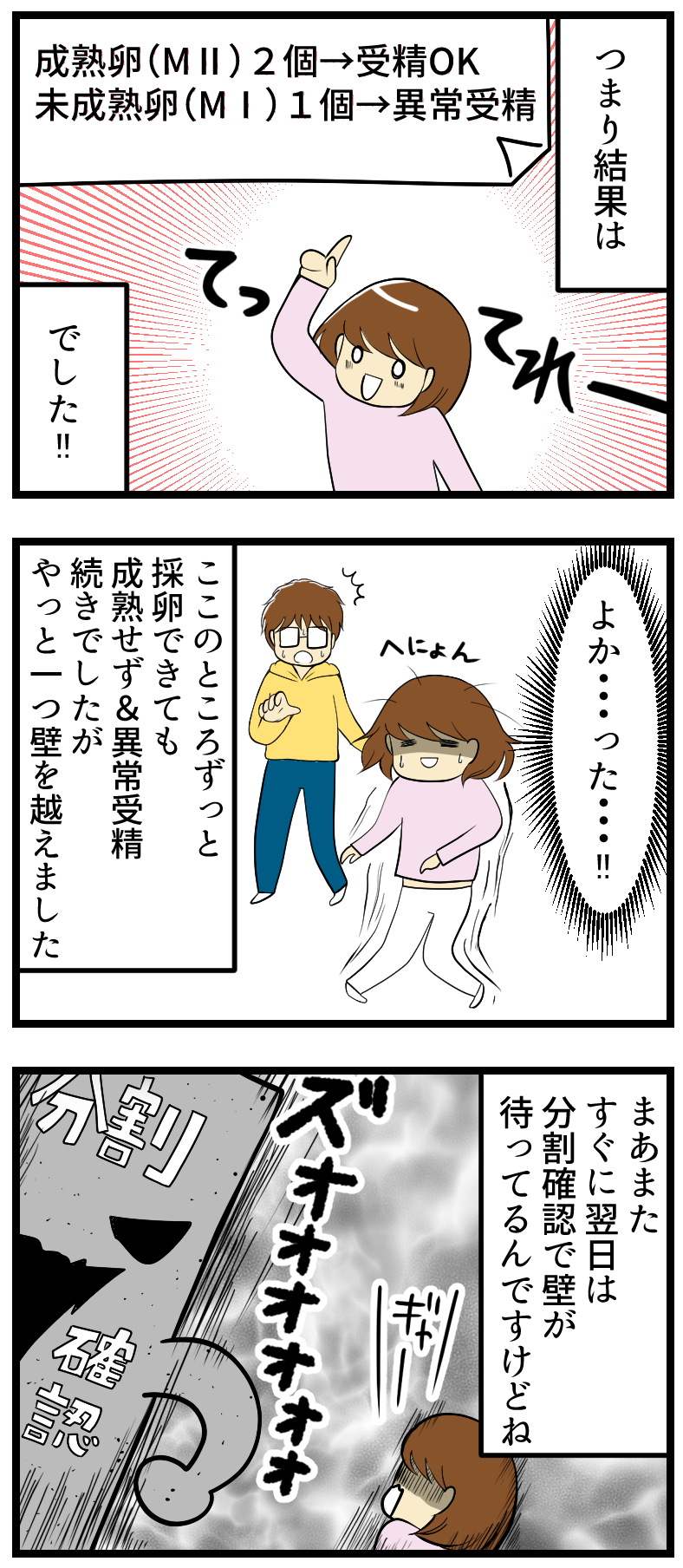 未成熟で採れた卵は残念ながら培養停止でしたが、成熟卵はちゃんと受精してくれました・・・よかった・・・!(もうこの時点で息切れ)