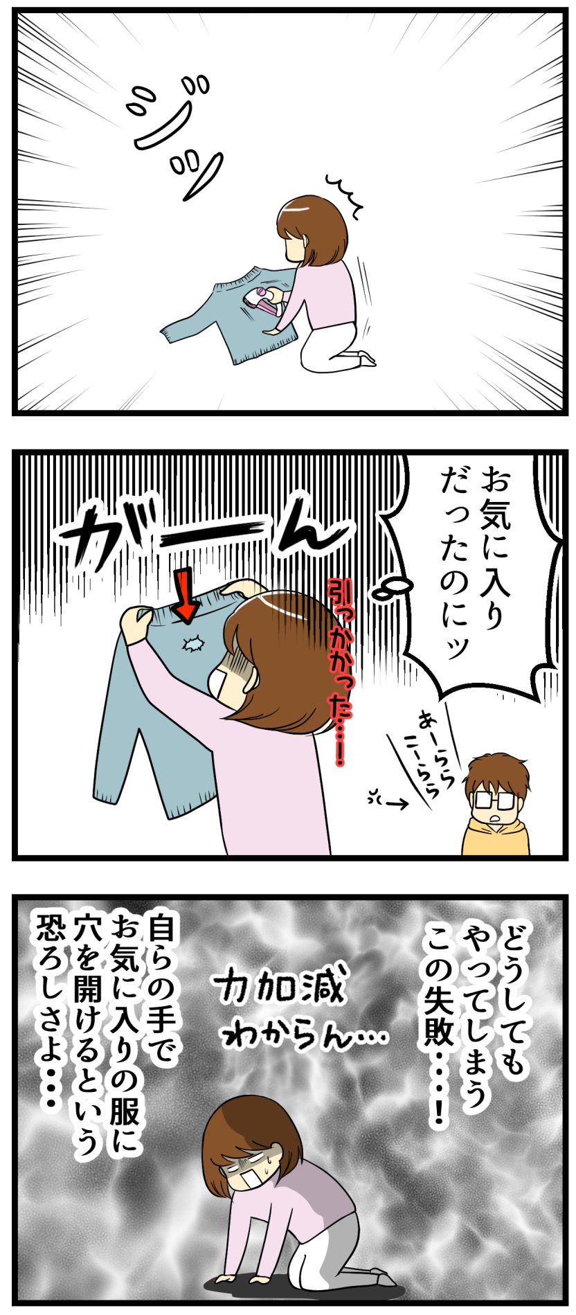 お気に入りの服に穴を開けてしまった時の絶望感ったらもう。泣ける。