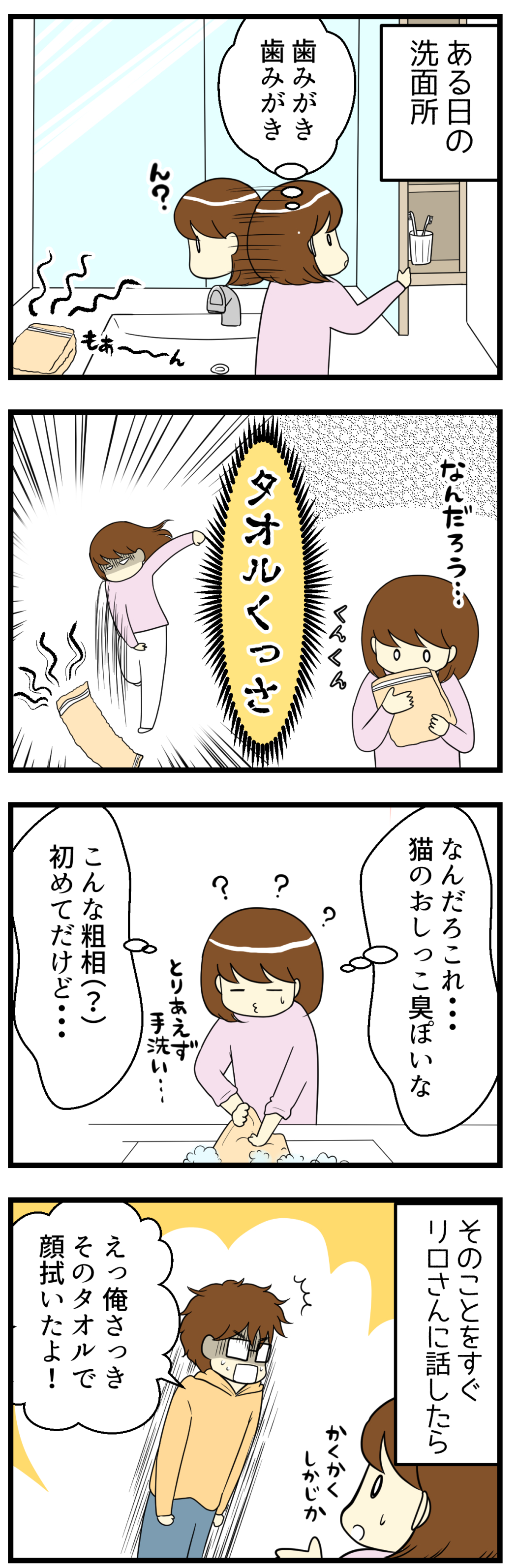 タオルからは猫のおしっこ臭がしたので犯人は猫だと思ってましたが、もしかしたら単純に夫が顔を拭いたにほい・・・?