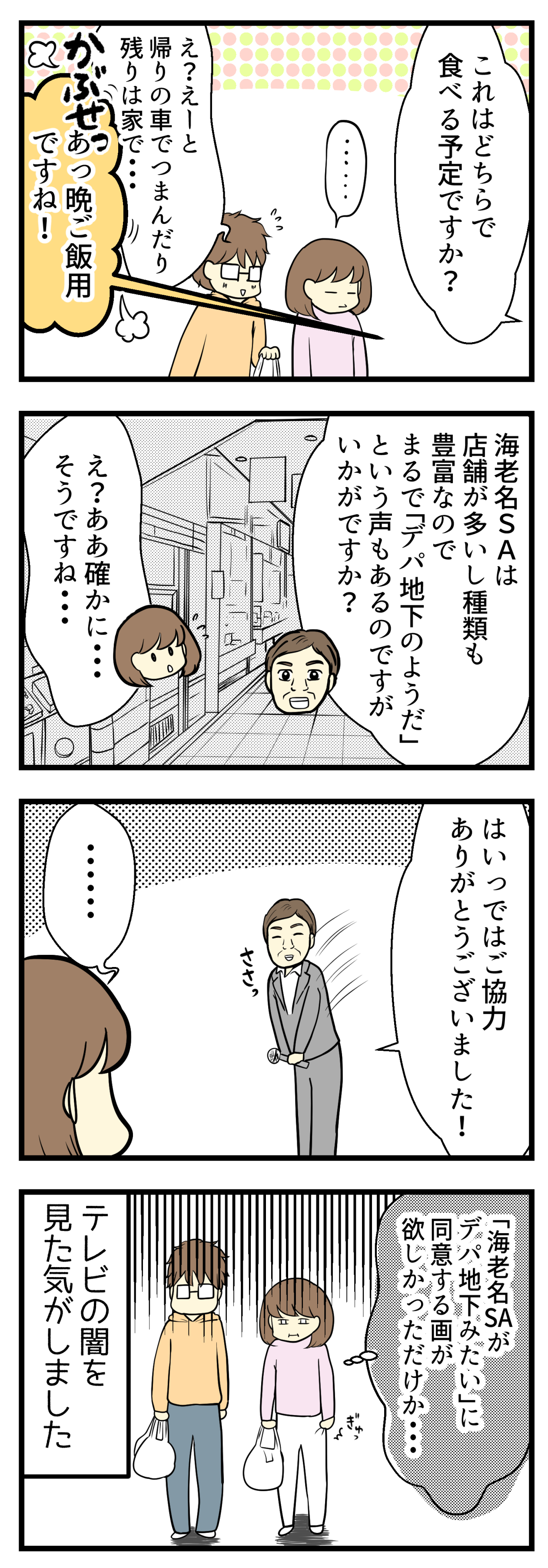 2019年07月31日 海老名サービスエリアでテレビのインタビューを受けた話 訪問いただきありがとうございます!海原(うみはら)こうめと申します。 このブログは不妊治療を終えた夫婦のその後、日常やら猫との生活などを漫画にしています。 ※リアルタイムの話ではありません。 このブログについて はじめから読む(第1話へ) 目次(総合目次へ) コメントとメッセージをありがとうございます。 ひとつひとつにお返事できず申し訳ありませんが、全部嬉しく読ませていただいています(^^) 世間は夏休み本番ですね!我が家は変わらず通常営業です\(^o^)/一生懸命答えようとしたのにッ(´;ω;`)海老名サービスエリアはデパ地下?確かに店舗数も多いしお土産屋だけじゃなく惣菜やお弁当も充実しているから、言われてみればデパ地下っぽい。漫画で描いた質問の他にももう少し話を聞かれてて、自発的な「デパ地下みたい」という言葉を引き出したかったのかもしれません。でもそのワードは先方から言われないと出てこなかったー!!○●○●○●○●○●○●○●○●○●○☆夫婦の日常話カテゴリはこちら☆☆妊活/不妊治療マンガはこちら☆◆サブブログで貧乏OLシリーズがスタートしています ◆こちらから読者登録をするとLINEに更新通知が届きます◆Twitterでも更新をお知らせしています◆不妊治療ブログが書籍化されました私が不妊治療をやめたわけ (コミックエッセイの森) [単行本(ソフトカバー)]◆ランキング2か所参加中です。クリック頂けると更新の励みになります! ○●○●○●○●○●○●○●○●○● 「リロさんと!夫婦の日常」カテゴリの最新記事 タグ :#夏休み#海老名サービスエリア#インタビュー < 前の記事次の記事 > コメント コメントフォーム 名前 コメント 記事の評価 リセット リセット 顔 星 情報を記憶 コメントを投稿する