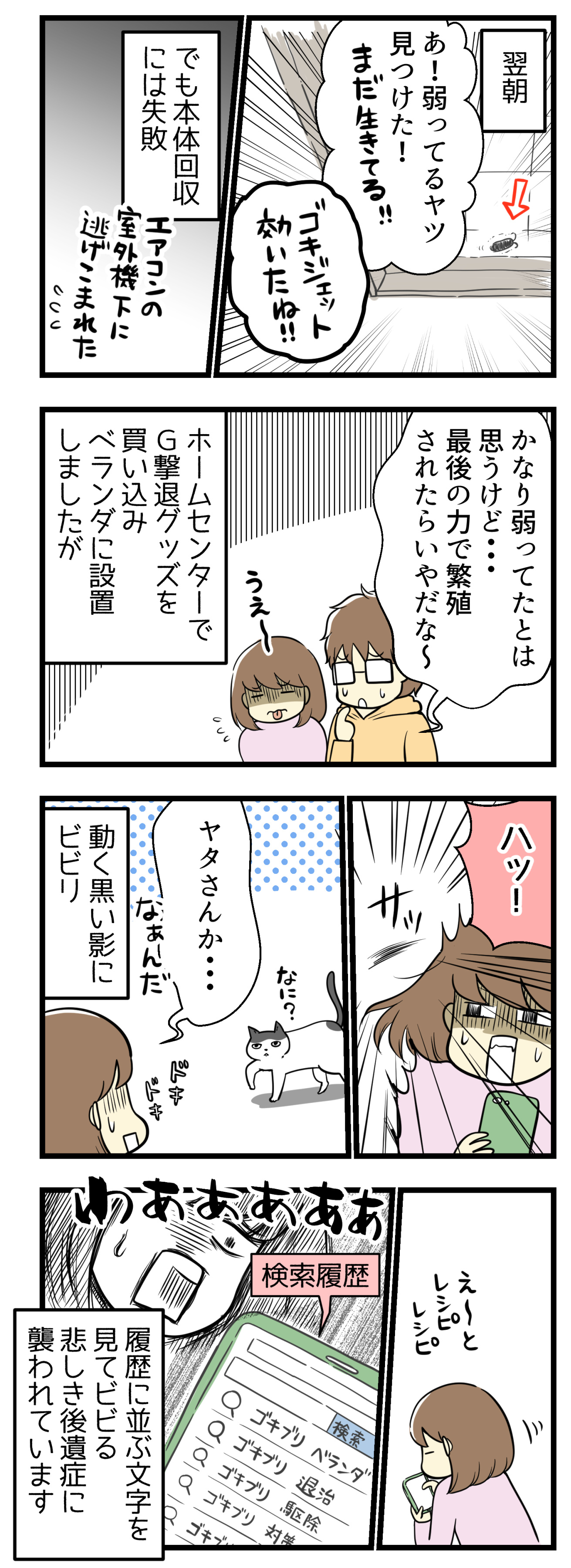 その後夫が帰宅した頃にはどこかへ隠れてしまっていたのですが、夜中に猫がいきなり我々のベッドに降りてきて壁に向かって飛びついた時、ゼッタイやつだ!!と確信して電気をつけたら案の定そいつで、慌てて夫を起こしてやっつけてもらいました。。