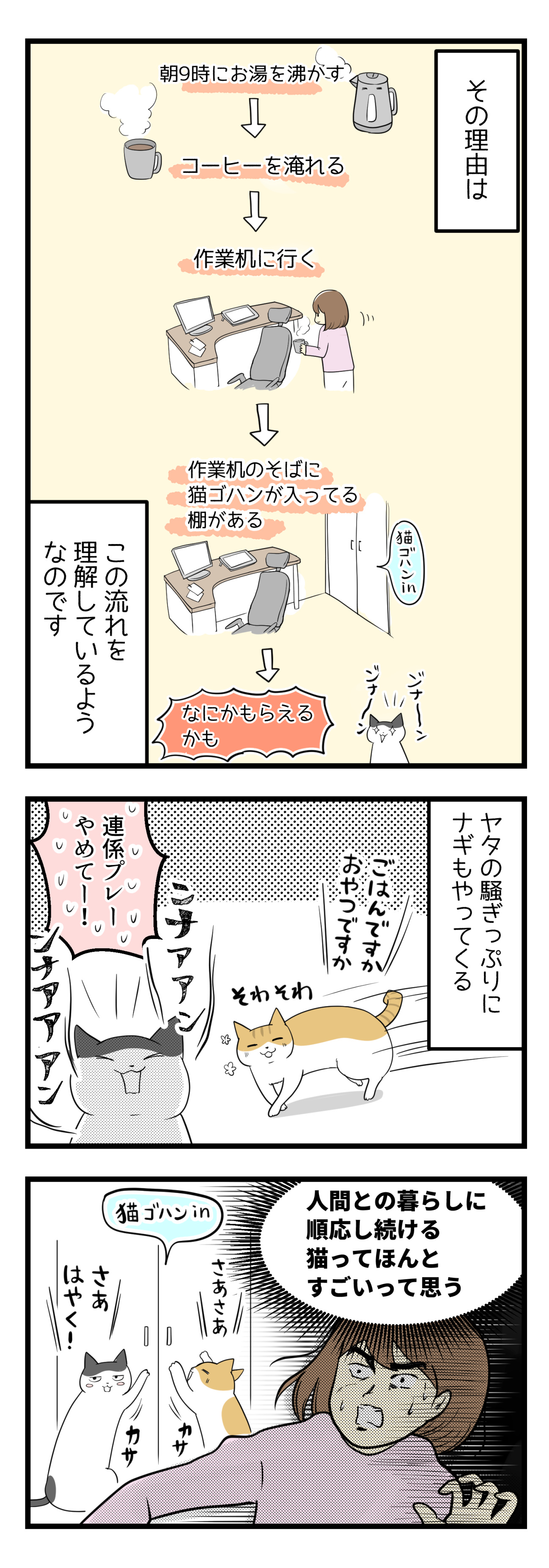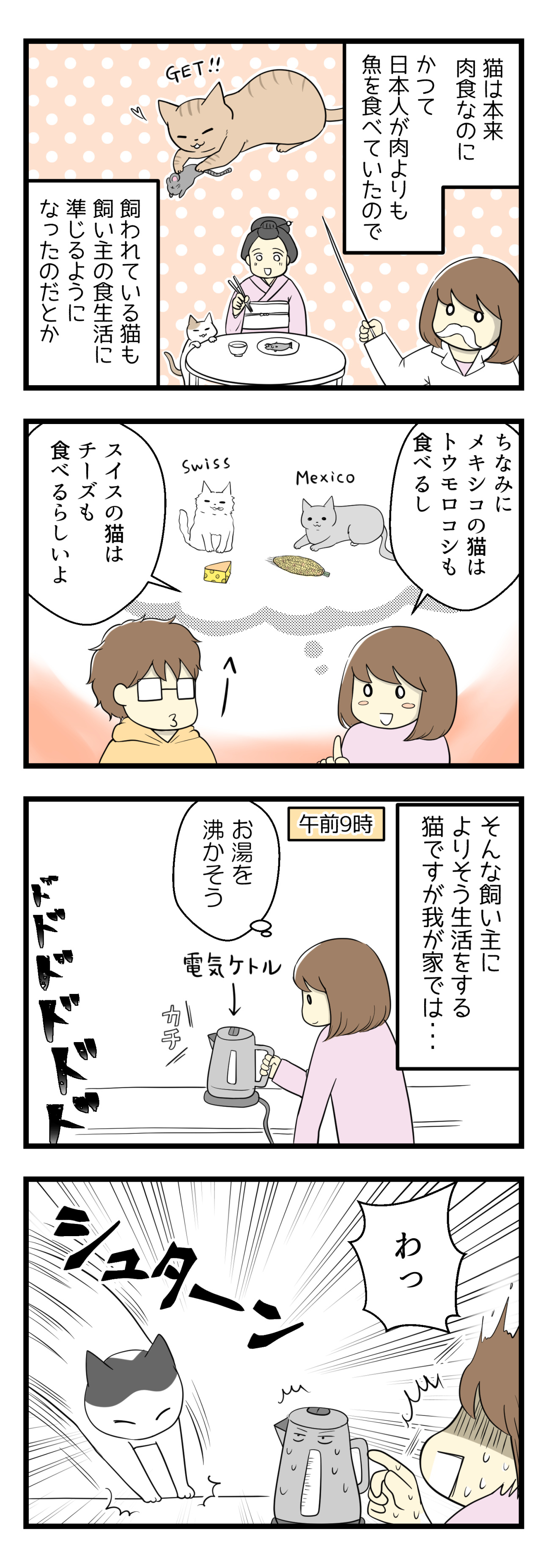 2021年05月05日 驚きの順応性でどんどん進化しそうって話 訪問いただきありがとうございます!海原(うみはら)こうめと申します。 このブログは不妊治療を終えた夫婦のその後、日常やら猫との生活などを漫画にしています。※リアルタイムの話ではありません。 このブログについて はじめから読む(第1話へ) 目次(総合目次へ) 猫たちの進化が止まらない コメントとメッセージをありがとうございます。 ひとつひとつにお返事できず申し訳ありませんが、全部嬉しく読ませていただいています(^^)こちらの生活習慣に合わせて猫も進化している・・・!その原動力は食への執着なのかなんなのか、とにかく驚かされます!!ちなみに朝・昼の作業時間帯にお湯を沸かしているとヤタがドドドド来ますが、夜だとお湯を沸かしてもコーヒーを淹れないのをわかっているようで特に反応しないという・・・\真顔ですがくつろいでいる・・・はず/\日向ぼっこ中・・・/\夫の体は相変わらず猫たちに大人気/☆ほかのお話↓・過去恋愛編です ・赤ちゃんを待ち望んでいました①(読者さんの妊活体験談) ☆こちらの漫画もよかったら(*´з`)↓・Amazonから怪しいメールが届いたよ-1-・YouTubeの動画レビューに踊らされる人々はこちらです ○●○●○●○●○●○●○●○●○●○◆こちらから読者登録をするとLINEに更新通知が届きます◆Twitterではブログに載せていない猫写真なども◆Instagramでは過去記事を再掲しています◆ランキング2か所参加中です。クリック頂けると更新の励みになります! ○●○●○●○●○●○●○●○●○● 「猫とか動物系」カテゴリの最新記事 < 前の記事次の記事 > コメント コメント一覧 (4) 1. 那須 2021年05月05日 09:24 猫ちゃんの環境適応能力はすごい! 実家にいた子はごはんと生クリームが大好きでした笑 日向ぼっこ中のヤタナギさんくんずほぐれつって感じですね(=^ェ^=) おまたにあるあんよが立派なにゃん玉に見えてしまったのは秘密です(言うとるがな) 0 海原こうめ がしました 3. 海原こうめ(管理人) 2021年05月06日 07:41 >>1 那須さん なんとごはんと生クリーム!!順応してるーーー!!(^^)/ 立派なにゃん玉・・・確かにそう見えるかも・・・!!いや見える・・・! そう思ったらもう玉にしか見えない・・・!! 0 海原こうめ がしました 2. リリー 2021年05月05日 13:01 日本の猫もチーズ食べますよ。うちの子はチーズかまぼこが好物でしたし、キャットフードもチーズ入りのものも売ってますね。メキシコの猫がトウモロコシを食べるのは初めて聞きました。日本も昔は猫まんま(かつお節にご飯)が定番でしたね。 0 海原こうめ がしました 4. 海原こうめ(管理人) 2021年05月06日 07:45 >>2 リリーさん おお~そうなんですね!キャットフードにチーズ入りのものがあるのは知らなかったです。考えてみればチーズかまぼこあたりは確かに好きそうです(^^)/ 私が小さいころに実家にいた猫もはじめは猫まんまでした。今やそれでは猫にとって栄養不足なんだとか・・・時代と共に認識も変わるのですね。 0 海原こうめ がしました コメントフォーム 名前 コメント 記事の評価 リセット リセット 顔 星 情報を記憶 コメントを投稿する