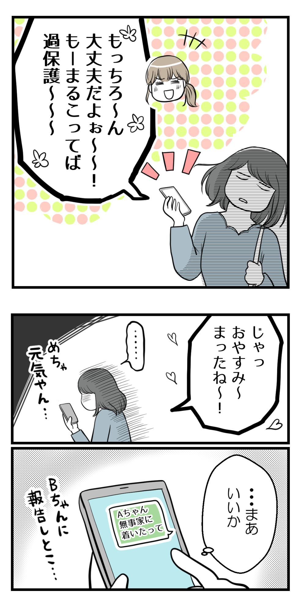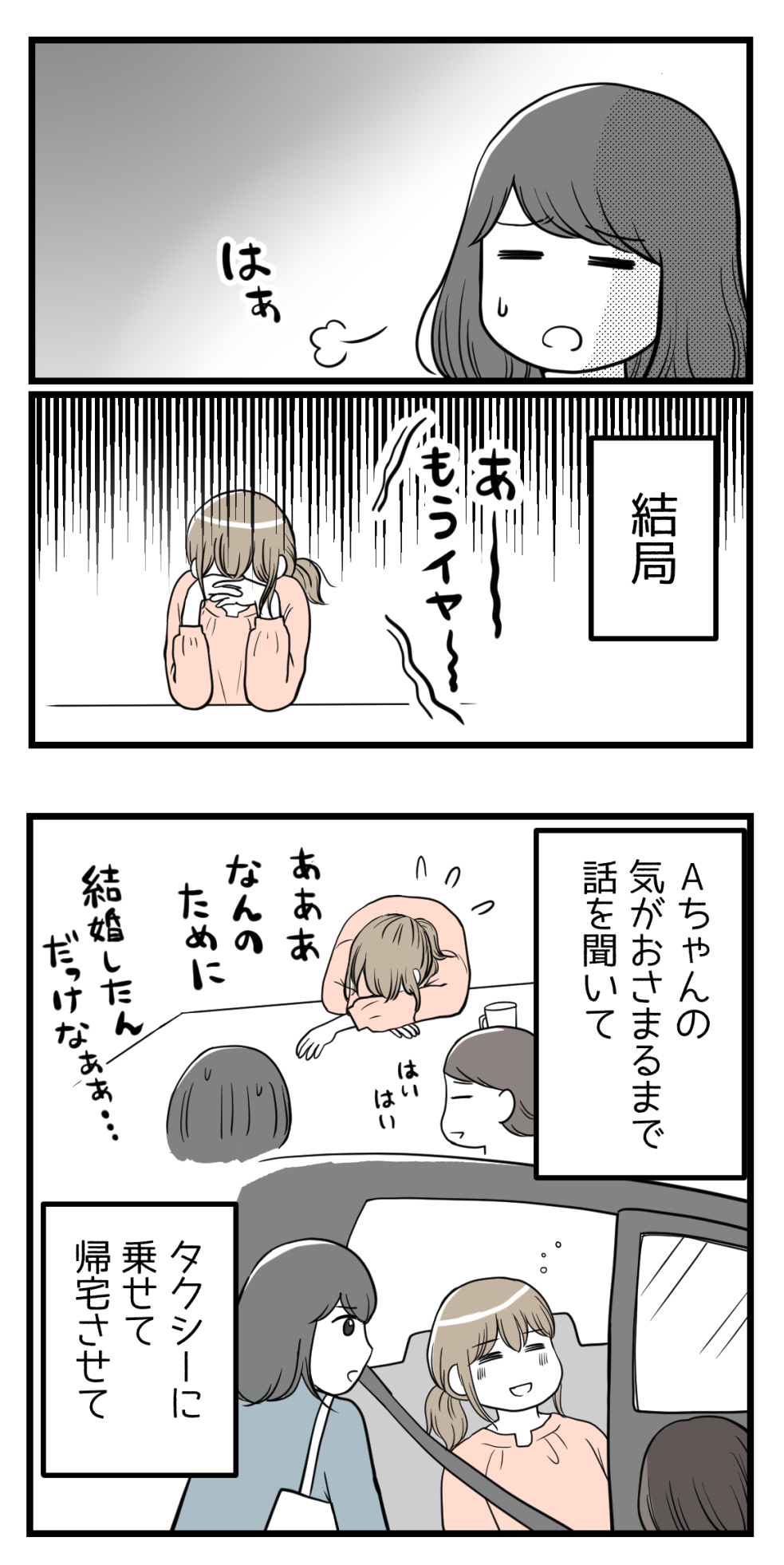 2022年04月22日 私の妊活だけ応援してくれない友人13【読者さん妊活体験談49】 訪問いただきありがとうございます!海原(うみはら)こうめと申します。 このブログは5年間の不妊治療を終えた夫婦のその後、読者さんの妊活体験談、過去の恋愛などを漫画にしています。※リアルタイムの話ではありません。 このブログについて はじめから読む(第1話へ) 妊活漫画の目次(総合目次へ) 読者さんの妊活体験談49-13今日は前回記事↓ の続きになります。←前のお話はこちらようやく帰宅。ですが…?次回に続きます!☆続きはこちら↓ ☆このお話をはじめから読む↓ 読者登録をするとLINEに更新通知が届きます手軽に最新話が読めますのでぜひ登録をお願いします!☆読者さんの妊活体験談シリーズをはじめから読む ☆他のお話はこちら↓ ○●○●○●○●○●○●○●○●○●◆妊活体験談募集中◆Twitterではブログに載せていない猫写真なども◆Instagramでは過去記事を再掲しています◆ランキング2か所参加中です。クリック頂けると更新の励みになります! ○●○●○●○●○●○●○●○●○● 「読者さんの妊活体験談一覧」カテゴリの最新記事 タグ :#妊活#不妊治療#体験談 < 前の記事次の記事 > コメント コメント一覧 (13) 1. ろこ 2022年04月22日 08:07 言葉汚いけど なんだコイツ… 0 海原こうめ がしました 2. ななし 2022年04月22日 08:21 超絶面倒臭い女・・・。この人、母親になってほしくない。 0 海原こうめ がしました 3. 何事も 2022年04月22日 09:06 優先順位を自分の中で明確にしないと、他人に振り回されるということですね。 0 海原こうめ がしました 4. えぇ〜… 2022年04月22日 10:34 まるこさんお人好しすぎ…。 無理矢理飲みたくないお酒飲まされ、渋々話しに付き合った挙句、ちゃんと帰ったか電話するなんて私には理解出来ません。Aちゃんより旦那さんに電話してあげて〜!って思っちゃいました(・・;) なんやかんや断り切れずお節介してあげてるから、2人からそういう接し方なんじゃないでしょうか。 もちろん悪いのはこの2人だけど、まるこさんも今後のライフステージを考え大事な旦那さんがいるなら、友達付き合い考えてほしいです!! 申し訳ないけどこの2人は、まるこさんの事"友達"なんて思ってなさそうで、頑張って合わせてるまるこさんを見てると心苦しさとモヤモヤな気持ちになります。泣 0 海原こうめ がしました 12. 同じく 2022年04月23日 10:38 >>4 友達に帰ったか確認の連絡するくらいマメな人ならば、それよりまず旦那さんに電話して欲しかったです。 その場で「電話してくる」って言いづらくても、夫婦で約束してるならば、そこはちゃんとした方が良いと思う。 0 海原こうめ がしました 5. さくら 2022年04月22日 10:49 ちゃんと帰れたかどうかの確認までして、優しすぎますね、、、 それなのに、ありがとうどころか、過保護〜って言われて。 散々でしたね。 疎遠にして、幸せに暮らしてください。 0 海原こうめ がしました 6. こじ 2022年04月22日 11:26 まるこさん人が良すぎ(⌒-⌒; ) タクシー乗せたならもうほっといて良いでしょ〜💧自分を大切にしてくれない人にそこまでしてあげられる神経が、私には分からな過ぎます^^; すごく良い人ですね✨ でも、そこまでしなくても相方Bさんにその辺りはお任せで良いと思います(╹◡╹) 0 海原こうめ がしました 7. すあま 2022年04月22日 12:45 皆でつまむフードメニューは周りに気を使うけど、ドリンクは好きなもの頼むし、帰る時間も決まってるなら、それで帰りますよ…💦 というか、飲み会前の連絡時に「○時まで帰らないといけないんだ」とか「アルコールダメだけど」とか、妊活じゃなくても先に知らせてるかな…。 お店によっては不衛生な調理のとこもあるし、ノンアル…添加物もりもりだし、ウーロン茶カフェインあるし、妊活ではアルコール以外にも色々気にしてました💦付き合いとはいえ、プレママとして後悔のないよう、まるこさん自分と赤ちゃん(予備軍でも)大事にして!!って読んでます。 私は卵子の状態も良くしたいと、着床時期以外も気にしてたから極端かもしれませんが…💦 0 海原こうめ がしました 11. 極端ではありません 2022年04月22日 21:56 >>7 妊活中は心が揺れるもんです 妊娠するの当人なんですから その気持ちを少しでも 父親になる夫が理解してくれることが 何より望ましいのですが 0 海原こうめ がしました 8. いっちゃん 2022年04月22日 14:05 本当の友達ではないですね。 優しいのを良い事に わがまま言って彼女だったら許されるって思っていますよね。 本当の友達なら 自分の都合だけで人を動かしたりしないし 相手の事ちゃんと考えます。友達だからこそ思いやりや感謝しなければならないのに。それができない人と無理に一緒にいて仲良くする理由は無いかなと思います。 0 海原こうめ がしました 9. みかこ 2022年04月22日 14:58 旦那さんもですが、、同じく同居の身としてはお義母さんの心象が悪くなりそうでハラハラしています。 旦那さんは