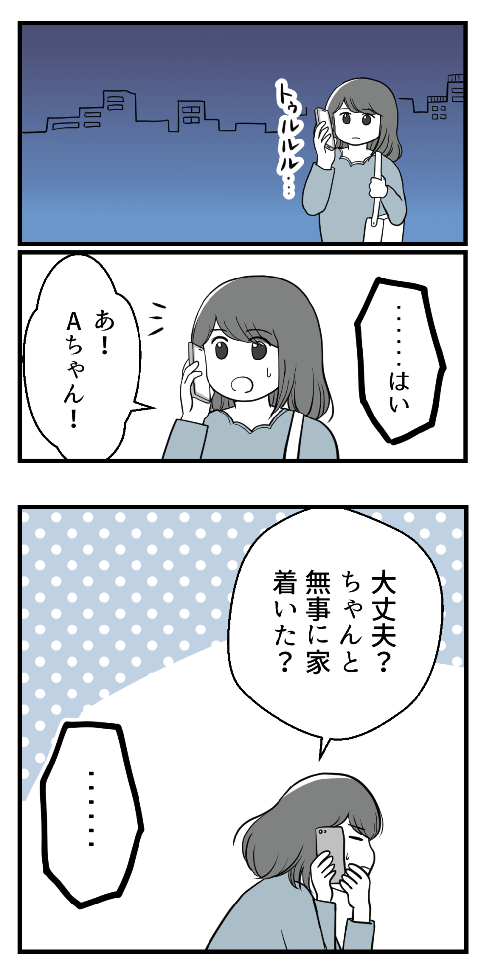 無理矢理飲みたくないお酒飲まされ、渋々話しに付き合った挙句、ちゃんと帰ったか電話するなんて私には理解出来ません。Aちゃんより旦那さんに電話してあげて〜!って思っちゃいました(・・;)