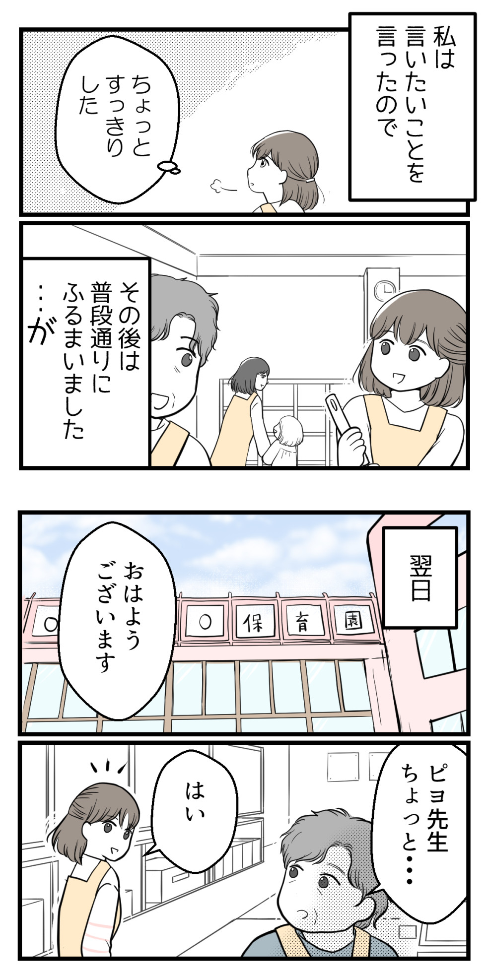 直後はつらいですよね…せめて1週間でも2週間でも経ったあとに妊娠報告してくれてたらと思いました。「あなたに1番に伝えたい」と言われても、園長先生や同僚より早く伝えるだけなら1〜2週間くらい我慢して欲しかったって思います。