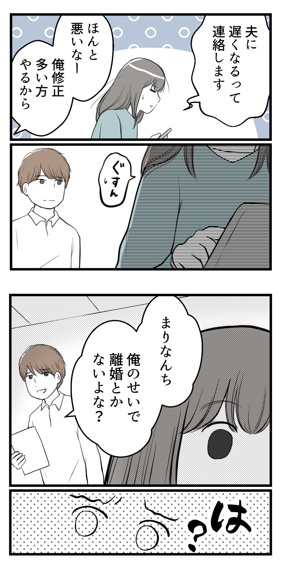 2022年06月02日 セクハラのきっかけは不妊治療でした1【読者さん妊活体験談52】 訪問いただきありがとうございます!海原(うみはら)こうめと申します。 このブログは5年間の不妊治療を終えた夫婦のその後、読者さんの妊活体験談などを漫画にしています。 このブログについて はじめから読む(第1話へ) 妊活漫画の目次(総合目次へ) 読者さんの妊活体験談52-1今回は読者さんの妊活体験談第52弾になります。全16話程度になる予定です。体験談を寄せてくださったまりなさん、ありがとうございます!次回に続きます!☆続きはこちら↓ 読者登録をするとLINEに更新通知が届きます手軽に最新話が読めますのでぜひ登録をお願いします!☆読者さんの妊活体験談をはじめから読む ☆他のお話はこちら↓ ○●○●○●○●○●○●○●○●○●◆妊活体験談募集中◆Twitterではブログに載せていない猫写真なども◆Instagramでは過去記事を再掲しています◆ランキング2か所参加中です。クリック頂けると更新の励みになります! ○●○●○●○●○●○●○●○●○● 「読者さんの妊活体験談一覧」カテゴリの最新記事 タグ :#妊活#不妊治療#体験談 < 前の記事次の記事 > コメント コメント一覧 (5) 1. マンナ 2022年06月02日 07:55 まだ分かんないけど… 離婚して欲しいのかな…? 0 海原こうめ がしました 2. なまえ 2022年06月02日 08:24 なんか…1話から生理的に無理な男性出てきたな💦 0 海原こうめ がしました 3. やよい 2022年06月02日 08:25 不妊治療してることをああだこうだ言われるのかな?たとえば性行為についてあれこれ口出しされるとか、子供できない夫より俺と…とか。やばい、考えただけで胸焼けがしてくる 0 海原こうめ がしました 4. やばい 2022年06月02日 11:17 タイトルのせいでまだ何も起きてないのに すでに上司がキモく見えてしまう、、、← でも普通に考えて他人のくせに 人様のうちの離婚だのなんだの言ってくる時点で セクハラ扱いしたいわ。 0 海原こうめ がしました 5. まなみ 2022年06月02日 11:52 俺のせいで離婚て言葉の中にはいろんな意味があると思うけど、俺のせいでって言ってるあたり自分にやたら自信があるというか、自分には夫婦を壊すくらいの魅力があるって勘違いしてるのかな… だとしたらひたすらキショい 0 海原こうめ がしました コメントフォーム 名前 コメント 記事の評価 リセット リセット 顔 星 情報を記憶 コメントを投稿する