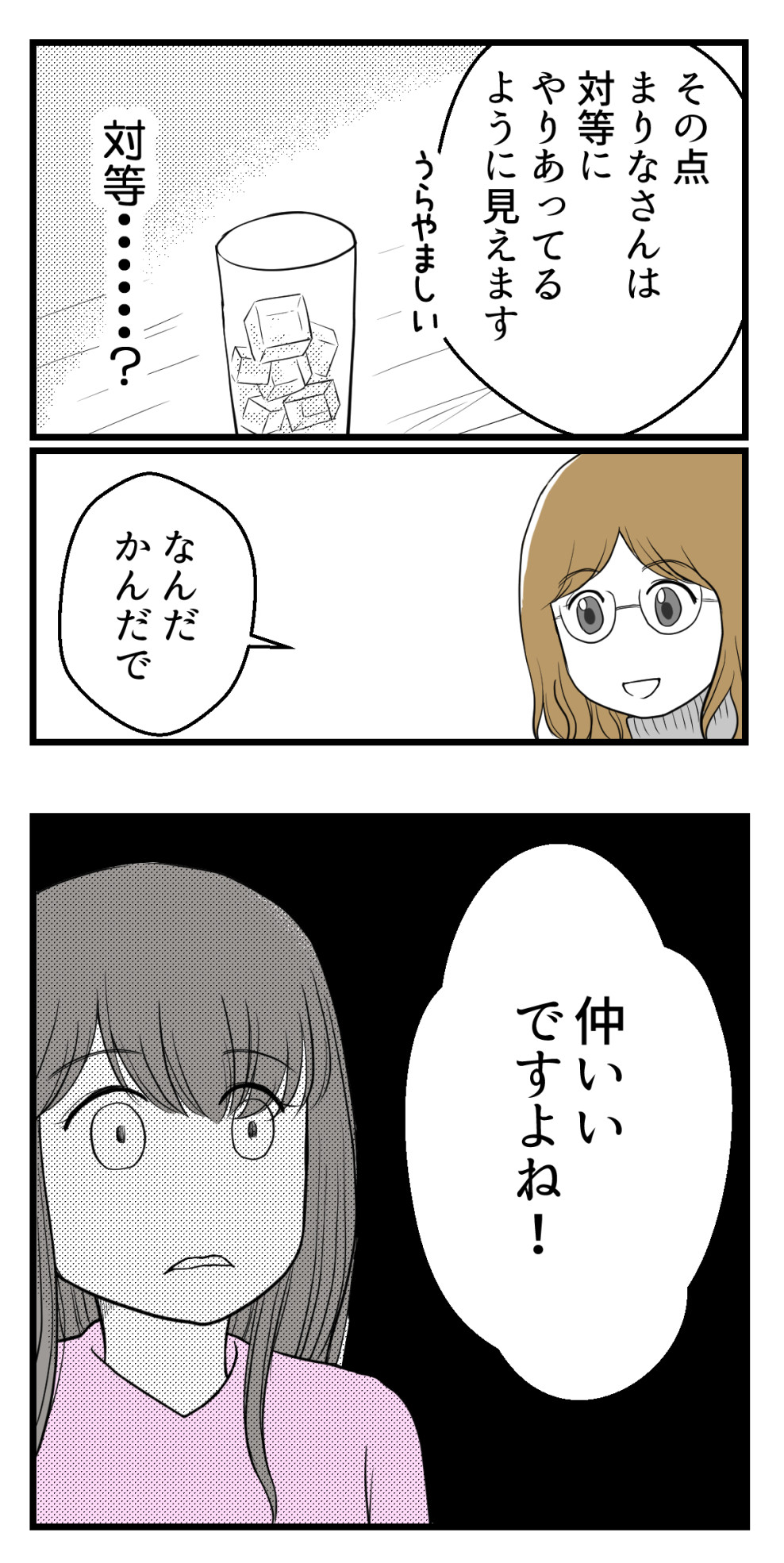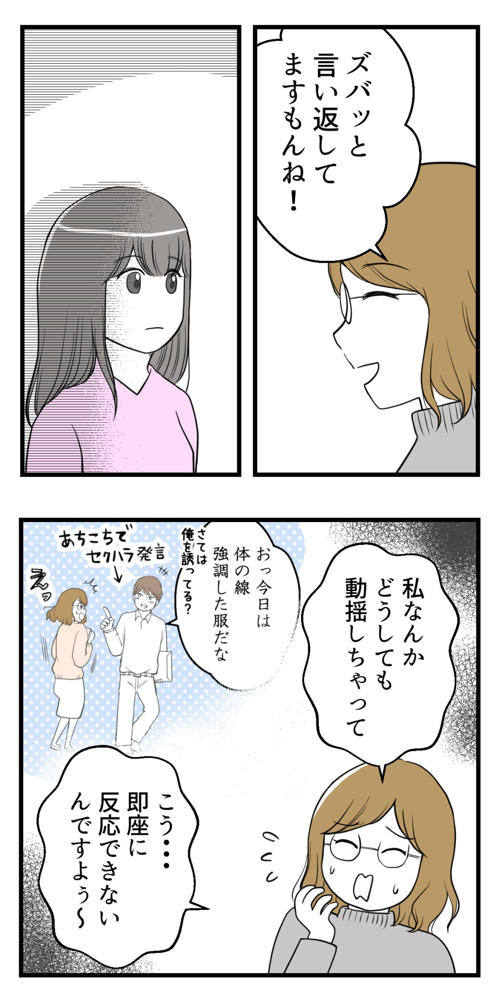 2022年06月11日 セクハラのきっかけは不妊治療でした7【読者さん妊活体験談52】 訪問いただきありがとうございます!海原(うみはら)こうめと申します。 このブログは5年間の不妊治療を終えた夫婦のその後、読者さんの妊活体験談などを漫画にしています。 このブログについて はじめから読む(第1話へ) 妊活漫画の目次(総合目次へ) 読者さんの妊活体験談52-7今日は前回記事↓ の続きになります。←前のお話はこちら周りからはそう見えるらしい。次回に続きます!☆続きはこちら↓ ☆このお話をはじめから読む↓ 読者登録をするとLINEに更新通知が届きます手軽に最新話が読めますのでぜひ登録をお願いします!☆読者さんの妊活体験談をはじめから読む ☆他のお話はこちら↓ ○●○●○●○●○●○●○●○●○●◆妊活体験談募集中◆Twitterではブログに載せていない猫写真なども◆Instagramでは過去記事を再掲しています◆ランキング2か所参加中です。クリック頂けると更新の励みになります! ○●○●○●○●○●○●○●○●○● 「読者さんの妊活体験談一覧」カテゴリの最新記事 タグ :#妊活#不妊治療#体験談 < 前の記事次の記事 > コメント コメント一覧 (11) 1. さくら 2022年06月11日 08:39 動揺する人もそれなりに悩んでる。けど、言い返せる人だって心の中では嫌だなって思ってるよ。仲が良く見えても、その裏側は本人にしか分からないよ。この女性みたいに言われると、自分が過剰に気にしてるだけなのか?って思って何も言えなくなるかも。 0 海原こうめ がしました 2. えーっ 2022年06月11日 09:01 じゃれているように見えるってこと?? もうノイローゼになりそう( ̄◇ ̄;)。 0 海原こうめ がしました 3. そんなわけあるかーーーー‼️ 2022年06月11日 10:14 同性にまでそんなふうに捉えられてるなんて、これはけっこう辛いな…。 ズバッと言い返すから、側からみたらノリツッコミの漫才、またはラブコメ風のじゃれ合いやってるように見えるんだろうな。本人がショック受けていても伝わらないの辛い。 同僚さんみたいにフリーズしていた方がショック受けてる困ってるって伝わるんだろうね。同僚さん言い返せなくて悔しいなら、フリーズしちゃうのを逆手にとって、すんって無言無表情で返しちゃうのもありかも? 0 海原こうめ がしました 4. みん 2022年06月11日 10:17 この後輩?の気持ちも分かりますが…共感してくれると思ってた女性にこう言われると辛いですよね 0 海原こうめ がしました 5. ルナルナ 2022年06月11日 12:53 私も似た経験あります。 タイムカード打刻の時(もう古いけど)、毎回パワハラ爺さん(上司)に別室に呼ばれ、セクハラ。 嫌で嫌で。 でも傍から見るとそう捉えられてなくて。 あの手この手やり返す方法考えている内に、今度はパワハラされるようになり… 辞めるしかなくなった。 だから…読んでて、涙が出ました。 0 海原こうめ がしました 6. なしこ 2022年06月11日 21:15 セクハラする人は相手の反応が楽しくてしているので、言い返したりすると逆効果だと思います ムキになったりもせずに冷静に返事だけしてればいいのにって思います 0 海原こうめ がしました 7. ぱるる 2022年06月12日 08:11 >>6 それかなり人として異常ですよね。 反応見て楽しむってサイコパスでしかない。 人の性格を直すことはできないし、スルーも対策のひとつではあるけど、言い返すことだって悪いことではないはず(この男には響いていないけど)逆効果であっても、やはり職場だし気持ちよく働きたいからこそ冷静に返事だけしてればいいと思えない人もそりゃあいますよ。 0 海原こうめ がしました 9. なしこ 2022年06月12日 18:21 >>7 気持ちよく働きたいから、セクハラをされない努力も必要では? 確かに相手にもよるかもしれないけど、言い返し方が冗談ぽかったり軽く流したりでは誰から見ても深刻には捉えられないのでは? 心の中でだけ抱えていて同性にも理解されないとショックを受けても…他人の事など理解できる人なんて逆にいるんでしょうか 0 海原こうめ がしました 10. つまり 2022年06月13日 06:02 >>9 セクハラを言う人より、セクハラをされないための努力をしない人の方が問題 と言いたいんですかね? なんだか全ての言い分を見てると、セクハラをどうにか正当化しようと必死に見えます。 0 海原こうめ がしました 12. ゆん 2022年06月14日 13:54 >>7 私も前に職場の上司に「私服姿もかわいいね❤️」とかメールされたり、直接気持ち悪いこと言われたりしてても、お世話になってるし、かなり立場が上で言い返すことすらできないし周りの信用もある人だったから誰にも相談すらできずに黙っていたけど、ストーカーみたいなセクハラ行為はエスカレートしていきました。。だから、言い返す、言い返さないは関係ないと思います。最終的に同期の男友達2人に相談して、その2人からガツンと言ってもらいました。。 0 海原こうめ がしました 11. まっすー 2022年06月13日 06:06 >>6 じゃあ、誰から見ても深刻に捉えて貰えるような振る舞いを