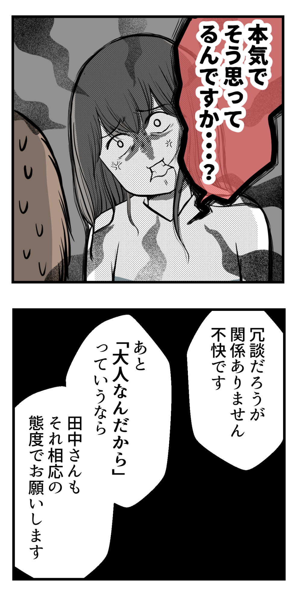 でも、田中は心の底から相手を不愉快にさせて悪かったと反省できるような男にはどうも見えない。今後謝罪をされても、その裏には「とりあえず謝罪さえすれば訴えられたりすることもないだろう」「もしチクられたら俺の立場がなくなる」っていう魂胆がありそう。田中本人に「申し訳ない」って気持ちが芽生えない限りは、また似たようなことをやらかすんじゃないかと。