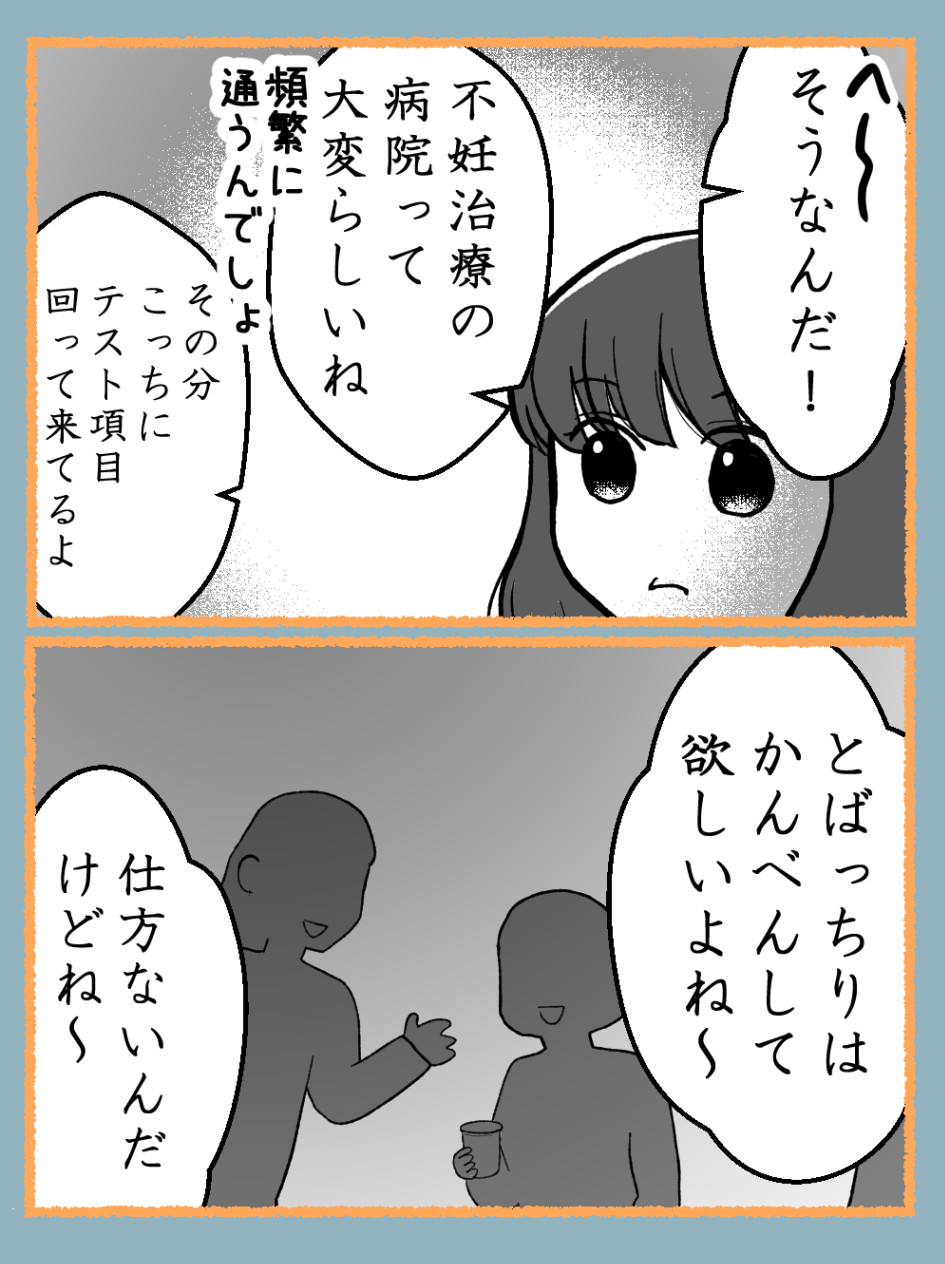 休む度に、またダメだったのね〜とか夜の営み、月経周期想像されるのも嫌だし、続ければ続ける程失敗してるって見られてるかもとストレスになりそう。思ってても言わないでほしいな。