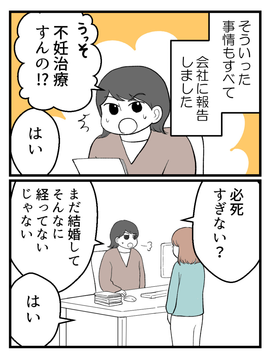 批判じゃなく、私も経験したことなので書きますが、自身のキャリアを考えるうえで、子育てしやすい会社かどうかを若いうちから検討することは大事だと思います。この先妊活にのめり込むようなら、仕事に支障が出てしまうように思います。プロジェクトのリーダーなら尚更かもしれません。