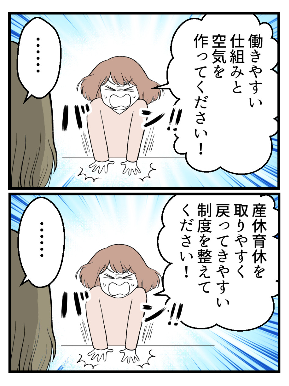 妊娠しても、ライフステージ変わってもこうした方が良いって希望あるなら、プレゼンした方良いと思う。感情的になるからこそ、社長も余計な事言うし伝わっていないと思う。